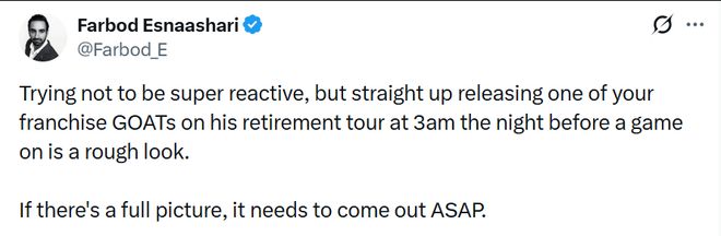 快船记者Farbod Esnaashari发推表达不满写道:“我尽量避免反应过度,但凌晨三点,也就是比赛前夜,直接把队史最佳球员之一从他的退役巡演中解约,这实在太不妥了。如果事情的来龙去脉有全貌,那就应该尽快公布。”